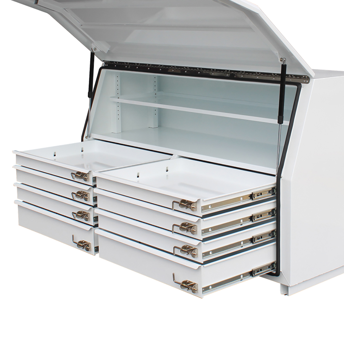 “description”: “The Steel Minebox tool boxes come with 8 half length drawers and 1 full length internal adjustable shelf for storage of small tools and parts.”,
